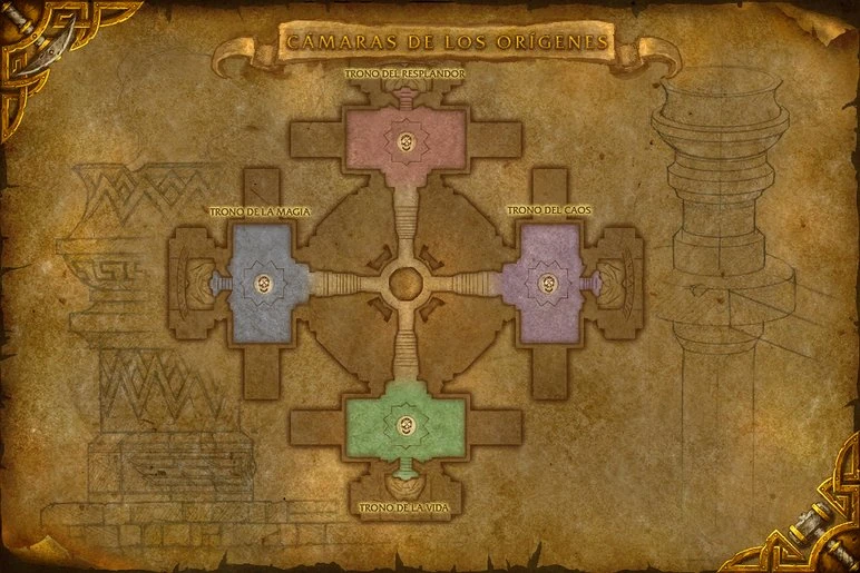 Construidas por los grandes titanes, las Cámaras de los Orígenes están repletas de reliquias antiguas y de los temibles guardianes que las protegen. Abundan los rumores de que el complejo también contiene un arma devastadora capaz de reordenar toda vida sobre Azeroth. Alamuerte ha actuado a través de su agente, Al'Akir el señor del viento, para obtener este terrorífico dispositivo [1].