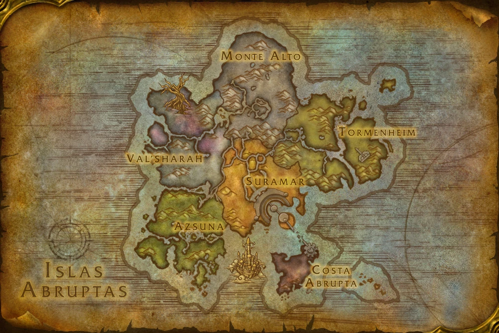 Aalgen Point · Acherus: El Bastión de Ébano · The Black City · Broken Valley · Cinder Run · Coal Ridge · Coast of Anguish · Crescent Ruins · The Crepping Grotto · Dark Stockades · Darkspear's Might · Darkstone Isle · Deadwood Landing · Mage Tower · Nether Disruptor) · Felbreach Hollow · Feldust Cavern · Forlorn Depths · Foulshore Strip · Garrison of the Fel · The Hijacked Portal (Bybeen Lair · Legion Command Ship · The Dreadex · The Dreadsoul) · Lion's Oath · Impsorrow Approach · Infernal Causeway · Jagged Cove · The Lost Temple · Path of Suffering · Puesto de Liberación (Command Center · Scavenger's Edge · Screaming Cliffs · Shadow Fracture · Soldier's Torment (The Pit of Agony) · Soul Ruin · Stonefin Shoals · Tomb Approach · Tumba de Sargeras (Mazmorra) · The Twisted Grounds · The Veiled Isles · Vengeance Point · The Weeping Terrace · Wrynnfall