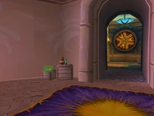 El segundo libro de la Ciudadela Violeta está escaleras arriba; en el suelo junto unas estanterías situadas cerca del portal que lleva a las Cavernas del Tiempo [26.5, 52.2].
