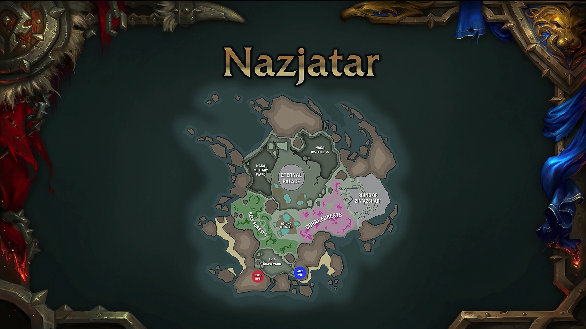 Nazjatar es la gran capital del imperio naga, construido en el interior de The Rift en el centro de la Vorágine. Es el lugar donde habitan la mayoría de los naga y donde sirven pleitesía a su reina, Azshara, dentro de un majestuoso y suntuoso palacio más grande que la extensión de su propio hogar situado en el centro de la ciudad.
