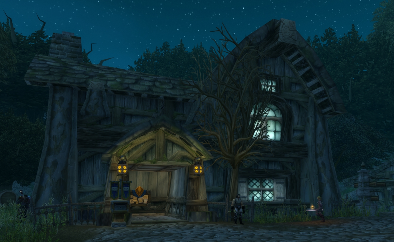 La Taberna del Cuervo Escarlata, localizada en Villa Oscura, Bosque del Ocaso. Era una vez un lugar alegre y amable llena de gente que se relajaba después de un duro día de trabajo en los campos. A pesar de que la chimenea se ha mantenido caliente, ahora tiene un público más taciturno, que se sientan por sus mesas y beben en silencio. La posada cuenta con varios asignadores de misiones, y unos pocos vendedores.
