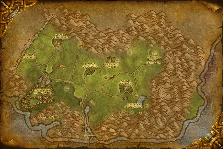 | Boulder'gor (Boulderfist Outpost) · Boulderfist Hall · Circle of East Binding · Circle of Inner Binding · Circle of Outer Binding · Circle of West Binding · Dabyrie's Farmstead · The Drowned Reef · Drywhisker Gorge · Faldir's Cove · Forbidding Sea · Galen's Fall · Go'Shek Farm · Hammerfall · Northfold Manor · Refugio de la Zaga · Castillo de Stromgarde (Crypt · The Sanctum · The Tower of Arathor) · Thandol Span · Thoradin's Wall · Witherbark Village |